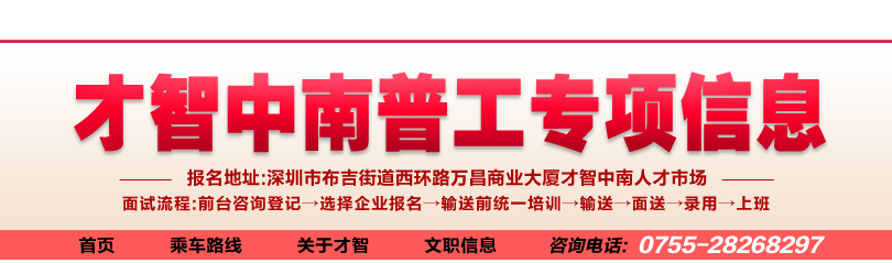 |  | 招聘时间:本单位正在招聘,请您01月02日(正常上班)11:00到才智中南人才市场集合输送,公交站:布吉中学 或 森鑫源学校 地铁站:长龙地铁站A出口 |