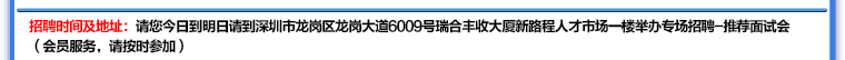 招聘时间及地址:以上岗位正在招聘中,请您带齐求职资料并着正装于周一至周五13:30到深圳龙岗区龙岗街道龙岗大道6009号瑞合丰收大厦新路程人力资源市场免费参加面试(无需电话咨询,直接前往即可)。